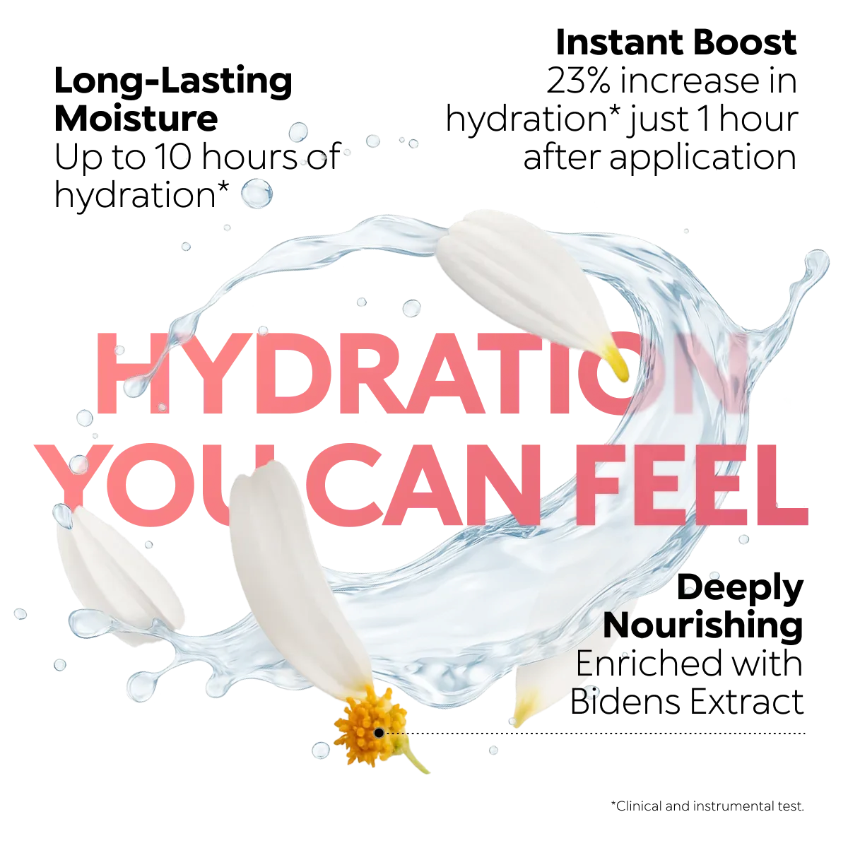 *Los resultados de tests clínico-instrumentales realizados con 20 mujeres han demostrado un aumento de la hidratación del 23 % una hora después de aplicar el producto