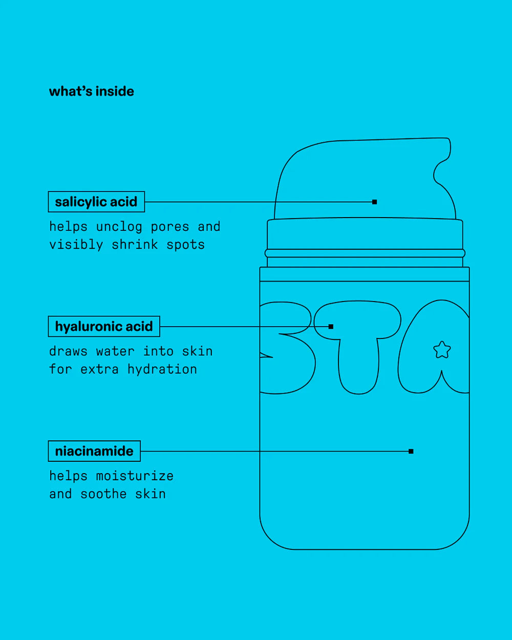 Star cream® + ácido salicílico es una crema hidratante sin aceite que ayuda a minimizar los brotes y reparar la sequedad para una piel feliz. La combinación más soñadora de ácido salicílico, ácido hialurónico y niacinamida trabajan juntos para desatascar los poros mientras se bloquea la humedad. Es como un abrazo para tu rostro, dos veces al día.
